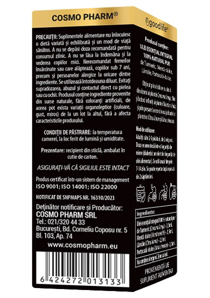 PRECAUTII DISCLAIMER/AVERTIZARE: prezentarea, proprietatile, indicatiile si modul de utilizare au la baza lucrari si publicatii stiintifice de specialitate, disponibile atat în format scris, cat si pe site-uri de referinta în aromaterapie și fitoterapie, precum și documentatia furnizorului sau producatorului de materie primă. Cu toate acestea, informațiile furnizate au un titlu pur informativ, nu pot constitui în niciun caz informații medicale și nu pot angaja responsabilitatea noastră. Produsul nu vindeca, trateaza sau previne afectiuni. Pentru orice utilizare in scop medical vă rugam consultati medicul specialist. Produs monitorizat cu atenție pentru practici cu impact redus asupra mediului înconjurător.