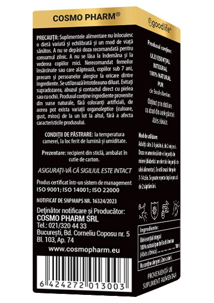 PRECAUTII DISCLAIMER/AVERTIZARE: prezentarea, proprietatile, indicatiile si modul de utilizare au la baza lucrari si publicatii stiintifice de specialitate, disponibile atat în format scris, cat si pe site-uri de referinta în aromaterapie și fitoterapie, precum și documentatia furnizorului sau producatorului de materie primă. Cu toate acestea, informațiile furnizate au un titlu pur informativ, nu pot constitui în niciun caz informații medicale și nu pot angaja responsabilitatea noastră. Produsul nu vindeca, trateaza sau previne afectiuni. Pentru orice utilizare in scop medical vă rugam consultati medicul specialist. Produs monitorizat cu atenție pentru practici cu impact redus asupra mediului înconjurător.