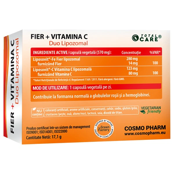Alegeti cu incredere Fier + Vitamina C Duo Lipozomal- Liposovit®-Fe si Liposovit®-C de la COSMO PHARM® pentru a va asigura ca organismul dumneavoastra primeste toate beneficiile pe care le ofera aceste elemente esentiale pentru sanatatea si vitalitatea dumneavoastra!