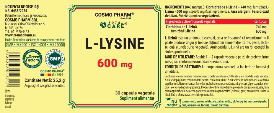 De ce să alegi L-LYSINE 600 mg de la COSMO PHARM®