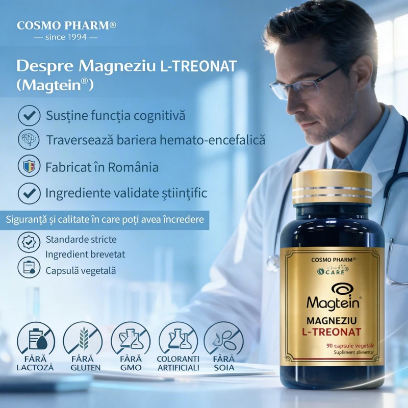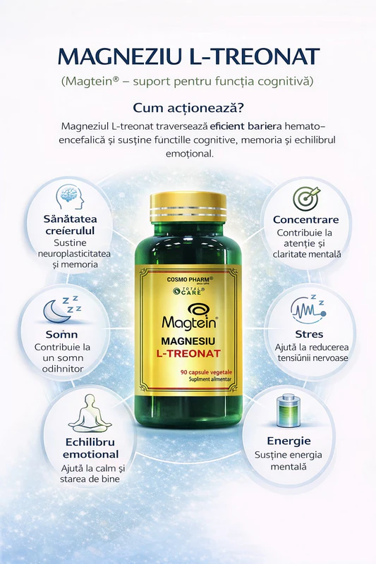 Magneziul L-treonat ajută atât creierul (memorie, concentrare, somn, stres), cât și organismul (energie, mușchi, oase, metabolism), fiind una dintre cele mai complete forme de magneziu disponibile.