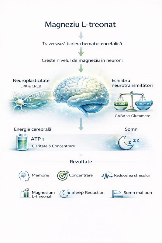 Magneziul L-treonat acționează direct asupra creierului, fiind una dintre puținele forme de magneziu care poate traversa bariera hemato-encefalică. Acest lucru îi permite să crească nivelul de magneziu în neuroni și să susțină memoria, concentrarea și funcțiile cognitive.