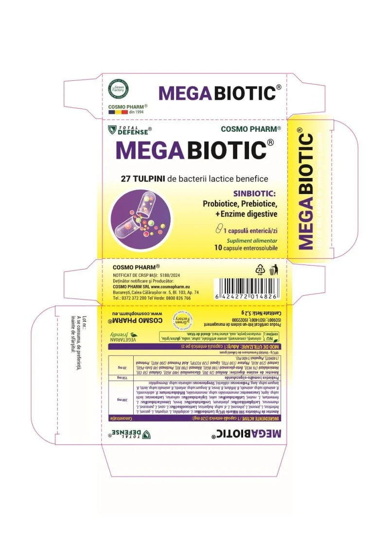 MEGABIOTIC® se remarca printr-o formula cu spectru larg, care combina 27 de tulpini probiotice (100 miliarde UFC), prebiotice si 7 enzime digestive intr-o singura capsula enterica, rezistenta la aciditatea stomacului. Aceasta capsula protejeaza ingredientele active, asigurand ca probioticele si enzimele digestive ajung intacte in intestin, unde ofera un suport complet pentru sanatatea digestiva si intaresc sistemul imunitar.