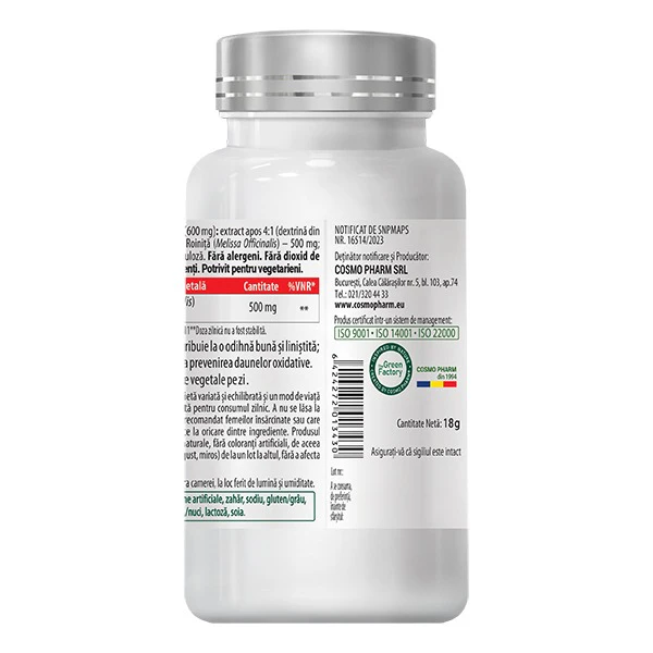 | Melissa (Melissa officinalis) extract 4:1 din frunze | 500 mg |