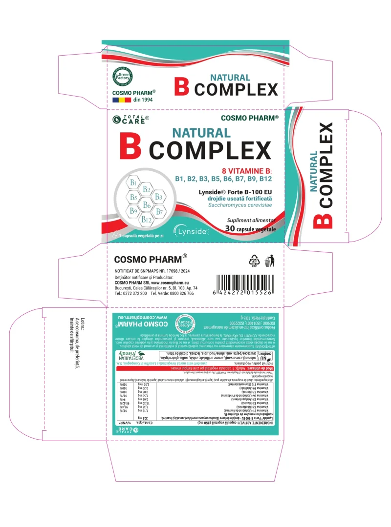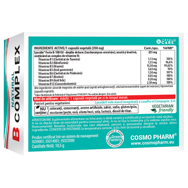Natural B Complex este o formula completa si naturala, care ofera toate cele 8 vitamine esentiale din complexul B: