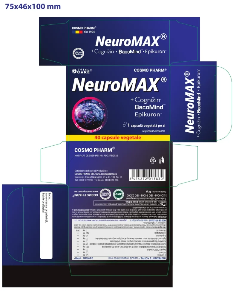 NEUROMAX® este un tonic cerebral, supliment natural neuroprotector, neurostimulator, nootropic si neurotrofic pentru circulatie cerebrala si memorie, formula exclusiva Cosmo Pharm, ce are in compozitie concentratii optime ale celor mai bine documentate plante cu actiune sinergica pentru sustinerea sistemului nervos: Cognizin® Citicolina, L-Carnitina, Taurina, BacoMind™️ – Bacopa monnieri, Ginkgo Biloba, Fosfatidil serina, Fosfatidil colina, L-Glutamina, Acidul alfa lipoic si B5. Un tonic excelent pentru creier.