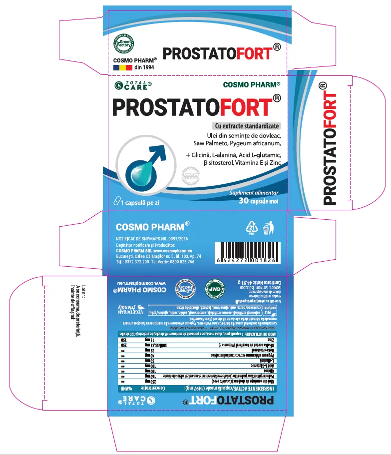 Barbati adulti: 1 capsula de Prostatofort pe zi, dupa masa, minimum 45 de zile, de preferinta 120 de zile. Evitati consumul de alcool. O cutie cu 30 capsule este suficienta pentru 30 zile.