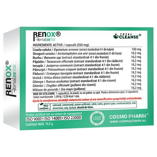 RENOX® Renal DETOX ajuta la filtrarea si eliminarea toxinelor din organism, imbunatateste functionarea tractului urinar si a vezicii urinare, stimuleaza imunitatea, ajuta la reducerea inflamatiei si elimina excesul de apa din organism.
