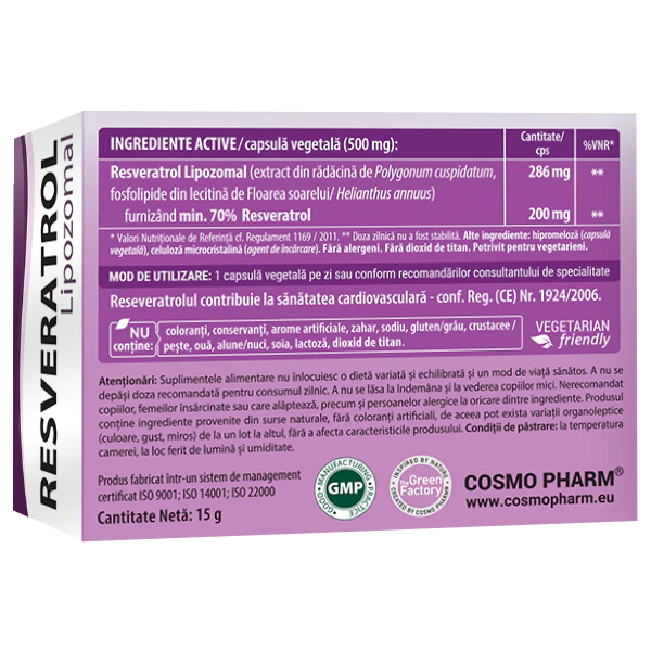 Resveratrol Lipozomal 200 mg este o formula avansata, bazata pe tehnologie moderna de livrare, conceputa pentru o absorbtie superioara si eficienta crescuta. Produsul contine resveratrol din sursa naturala, extras din radacina de Polygonum cuspidatum, incorporat intr-un sistem lipozomal cu fosfolipide din lecitina de floarea-soarelui, pentru o biodisponibilitate optima.