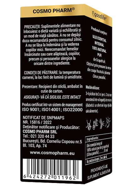 Produsul conţine: ULEI ESENTIAL INTEGRAL 100% NATURAL PUR de Grapefruit. Obtinut prin presare la rece din coaja fructului plantei Citrus paradisi.