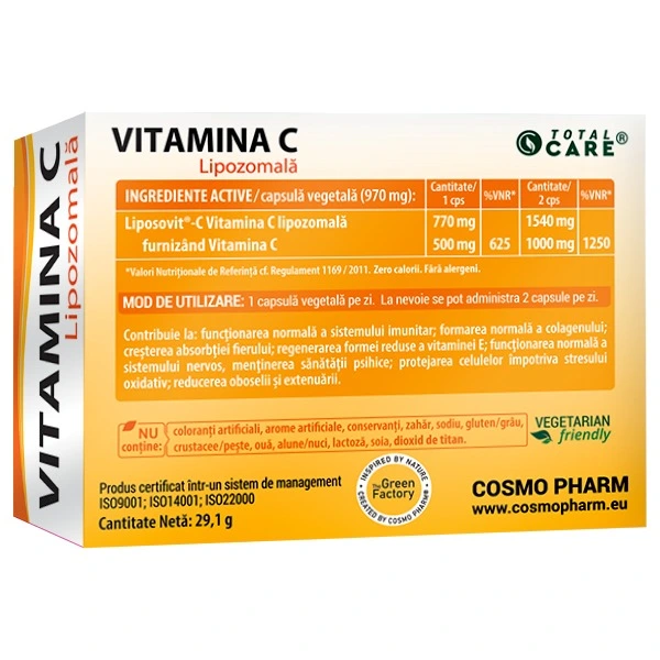 - Beneficii aditionale ale fosfolipidelor: lipozomii sunt formati din fosfolipide, care, atunci cand sunt absorbite impreuna cu vitamina c, ofera beneficii suplimentare pentru sanatate, cum ar fi sustinerea functiei si integritatii membranelor celulare.