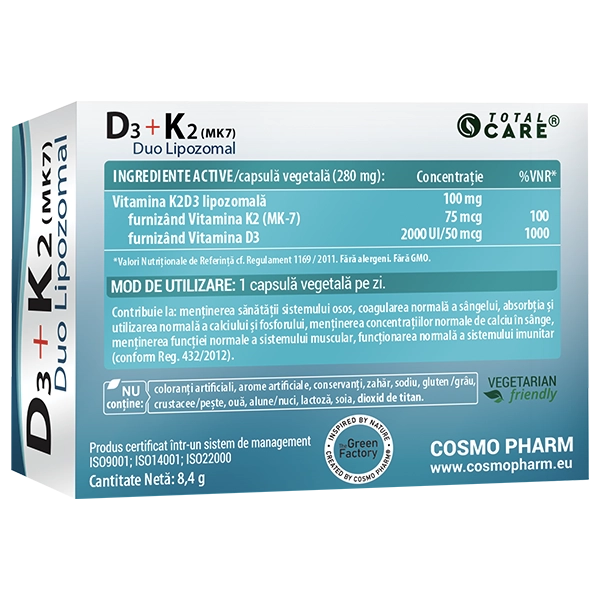Particularitatea vitaminei K2 in acest duo lipozomal, sub forma Menaquinonei-7 (MK-7), ofera o activitate biologica superioara si o biodisponibilitate crescuta, asigurand o eficienta sporita in utilizare pe termen lung.