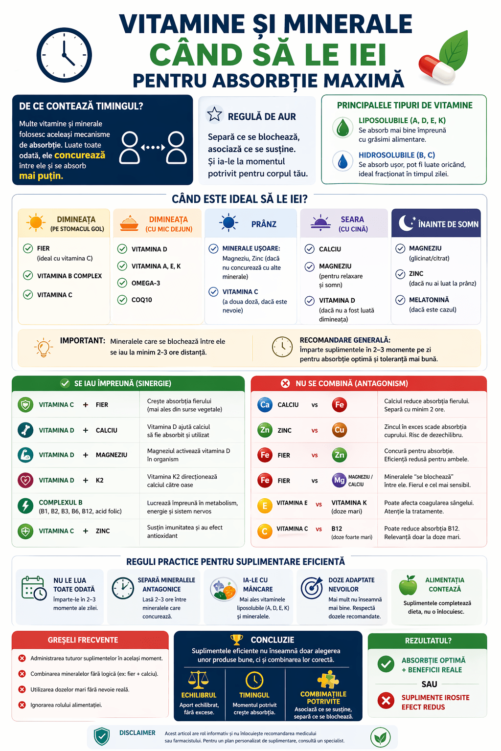Momentul administrării influențează absorbția. Separarea mineralelor antagonice și asocierea celor sinergice pot face diferența. - Combinațiile potrivite